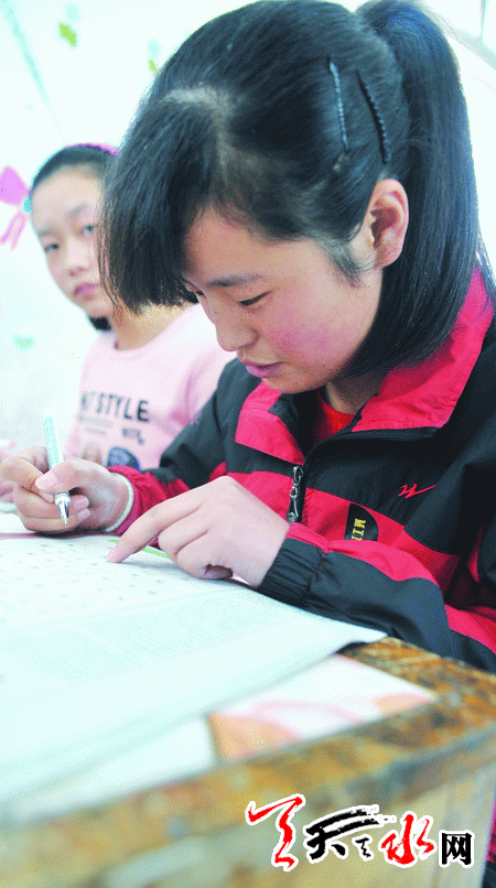 虽然娘娘坝刚经历了一场洪灾,学校也受到了损失,但同学们对汉字书写活动的认真投入,丝毫没有受到影响。比赛现场,同学们低着头认真思考着笔下的汉字,有的眉头紧锁,有的下笔如神,还有的同学紧紧地握住手中的笔,神情严肃的思考着成语,让我们不忍去采访。