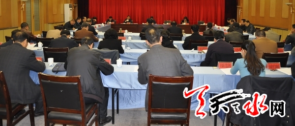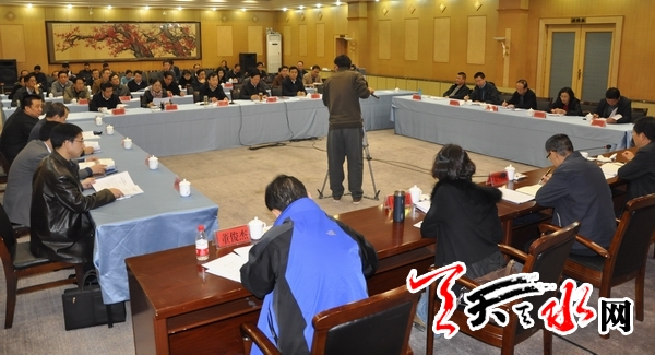 随后,天水市在天水迎宾馆召开情况汇报会。中共天水市委副书记、代市长杨维俊主持会议。天水市副市长雷鸣汇报了天水市2013年省政府目标任务完成情况和全市招商引资暨兰洽会签约项目落地实施情况。天水市人民政府秘书长逯克宗参加汇报会。
