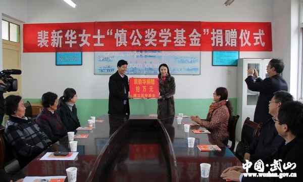 11月11日,裴新华女士专程从北京赶赴武山,为慎公中学捐资10万元,正式建立了“慎公奖学基金”。在当天举行的捐赠座谈会上,武山县为裴新华女士颁发了“情系家乡、造福桑梓”荣誉证书。裴新华女士深情地说,是家乡的山水养育了他们一家人,爷爷和父辈们一直关心家乡的教育事业,她作为晚辈,只是为老家的教育事业和下一代成长尽了一点自己的心意。