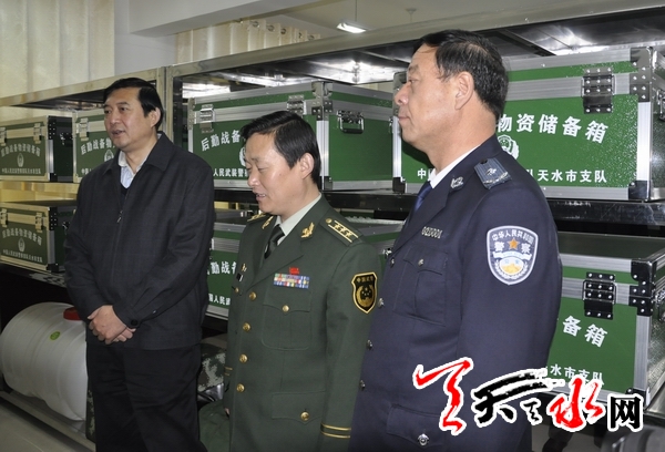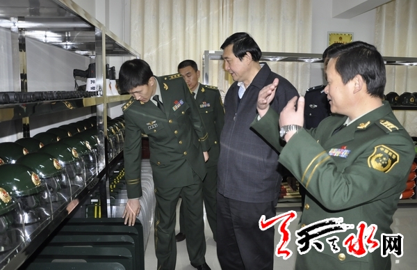 当天,赵卫东等实地查看了武警天水支队战备物资储备库,详细了解了部队建设、官兵生活和工作等方面的情况,并听取了情况汇报。