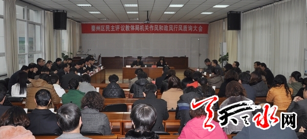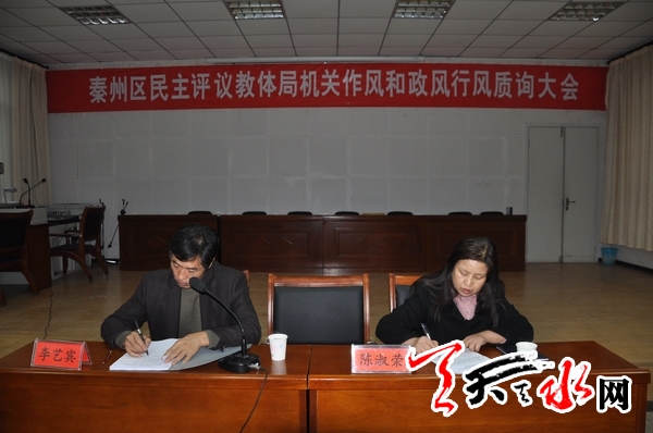天天天水网讯 为进一步改进工作作风,提高工作效能,11月22日,秦州区召开民主评议区教体系统机关作风和政风行风工作质询大会。秦州区纠风办,评议工作组、行风特邀监督员、服务对象代表,区教体局干部职工共计100余人参加了评议大会。