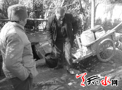 “哎,没办法啊。我从早上七点钟开始排队,这会儿才开始打水。”老人歇了口气对记者说。一看表,此时已是上午十一时。老人指了指旁边一辆架子车上的四个桶,“拉这样一车水,我们老两口能吃一周。”老人说,孩子们打工去了新疆,家里就留下66岁的她和年逾七旬的老伴,今天因老伴生病所以只能她来打水,等水接满后老伴会来帮她把车推回家。