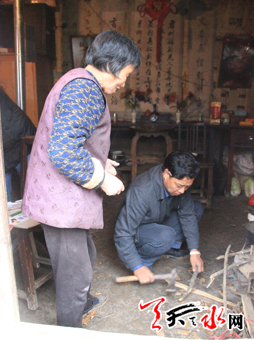(阮全喜帮清水县草川村的孤寡老人劈柴)