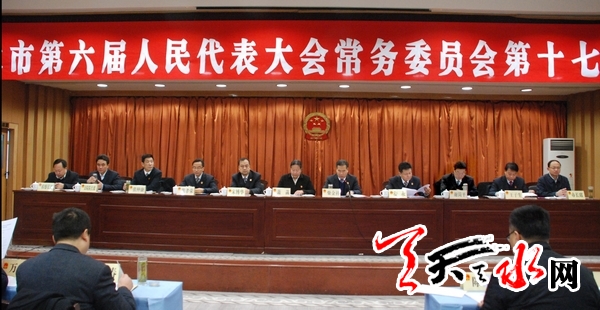 天天天水网讯(记者孙燕芸)12月10日,天水市第六届人民代表大会常务委员会第十七次会议在天水迎宾馆召开,市人大常委会主任柴金祥、市人大常委会副主任谢简平分别主持第一、第二次全体会议。会议应到常委会组成人员41人,实到34人,符合法定人数。