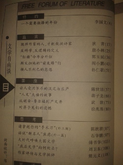 《文学自由谈》由天津市文联主办,是国内颇具影响的文学评论期刊,该刊向来被誉为“是一本努力表达文坛民意的学术期刊”,被视为文坛的窗口。作家王蒙说:“在我们的生活中,有《文学自由谈》和没《文学自由谈》,是不一样的。”《文学自由谈》创办于1985年,该刊从2003年起,每期都推出一位作者作为封面人物,刘心武、李国文、冯骥才、蒋子龙、何满子、张颐武、韩石山、邓刚、王蒙等名家都曾是《文学自由谈》封面人物。