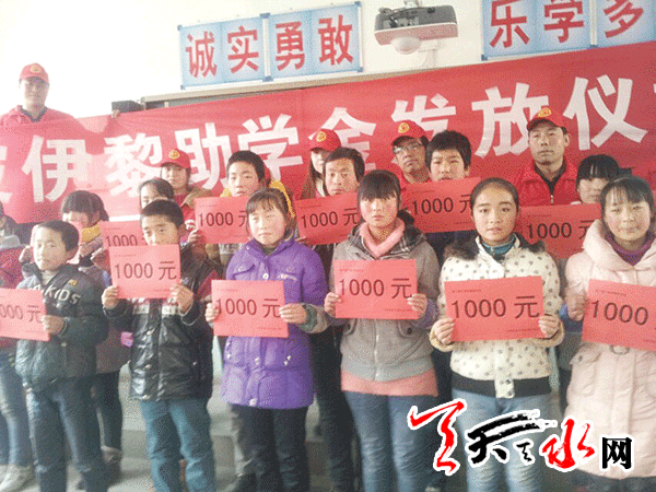 2014年1月1日,正值元旦佳节,张家川县闫家中心小学校园里不时传来阵阵掌声,全县第三期伊黎助学金集中发放仪式正在这里举行,张家川县海水爱心团队的15名志愿者为孩子们发放助学金54000元。