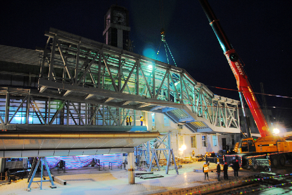 为更好地方便旅客乘车,避免旅客进出站人员对流,进一步优化客运组织,提升车站整体形象,天水车站于2013年10月8日开工建设全封闭钢架结构、横跨链接三个站台的单侧下行跨线人行天桥。(强科 刘斌)