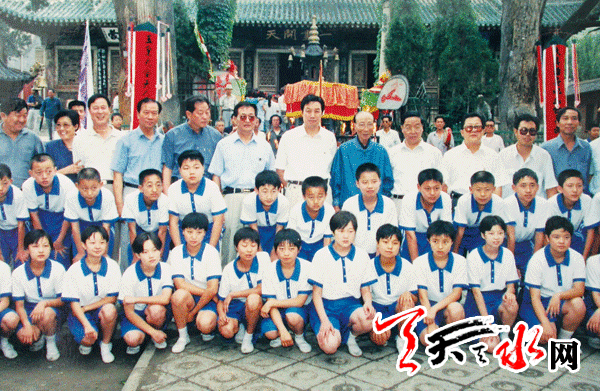 上世纪九十年代,邵逸夫先生(右五)来天水视察捐建项目,与当时的市领导及逸夫中学的师生在伏羲庙合影。 (供图 市教育局)