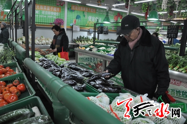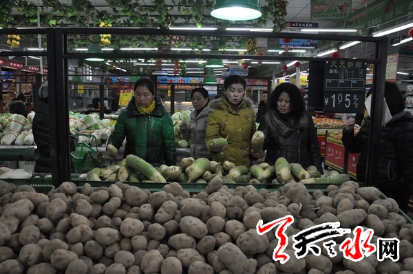 1月14日,天水市民正在秦州区天天乐菜篮子超市挑选蔬菜。据了解,为了维护两区春节期间蔬菜、大肉价格稳定,天水市政府从全市价格调节基金中拿出120万元,储备了大白菜、土豆、萝卜等6种大宗蔬菜1200吨和100吨大肉调节市场供应。目前政府储备菜已经投放市场。记者 吕薇 摄