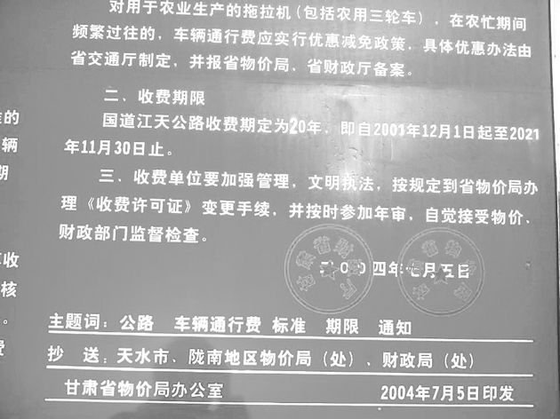 而记者从该批复文件的附件中也看到,国道316线江洛镇至天水公路,批准收费起始和终止日期分别是2001年12月1日起至2021年11月30日止,和公示牌上的一致。