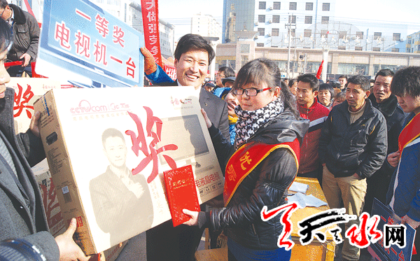 天天天水网讯(记者 罗双红)1月17日,甘谷县外出务工人员在领取奖品。当天,天水市人社局、市劳务办联合各县人社、劳务部门组织的全市“春风行动”欢迎外出务工人员回家探亲暨表彰优秀务工人员仪式,分别在甘谷县、武山县、清水县、张家川县同步举行,全市优秀劳务经纪人和80多名优秀务工人员领取了电视机、洗衣机、电饭锅等总价值13万多元的大件奖品。