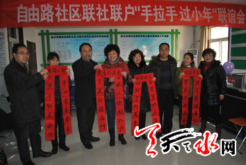天天天水网讯【记者蔚军平】1月20日,秦州区西关街道办自由路社区举行了联社联户“手拉手过小年”联谊会,街道、社区干部与各自的双联对象欢聚一堂迎新春。