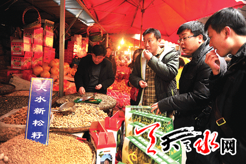 采访中,在秦州区箭场里市场专卖干果的吴女士告诉记者:“进入腊月后,干果市场明显热闹起来。这段时间,各类干果的价格趋于平稳,没有因过节的原因上涨。比如:本地松子每斤35.00元-40.00元,瓜子8.00元-10.00元,麻子10.00元,都和平时的价钱相差无几。”