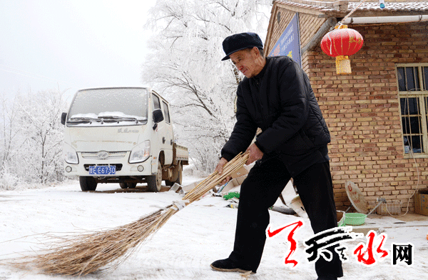 2月7日大清早,记者来到秦安县王窑乡张富汉老人家,勤快的他正拿着扫帚扫着门前的雪。