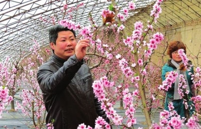 看着身边争相绽放的桃花,杜建红给记者算了一笔账:“我家共有3个设施温棚油桃,目前已经全部开花正在授粉,经过后期的蔬花、蔬果等科学管理,4月份即可上市,倘若价格与去年持平,每公斤平均30元上下,少说也能收入6万元。”杜建红对今年的收成充满了信心。前来察看油桃长势的村支书杜福才说:“最近几年,村里利用反季节设施油桃增加农民收入,一座0.2分亩的设施油桃可收入2万多元,目前全村已经发展油桃大棚60多座,设施油桃已成村民收入的一大支柱。”