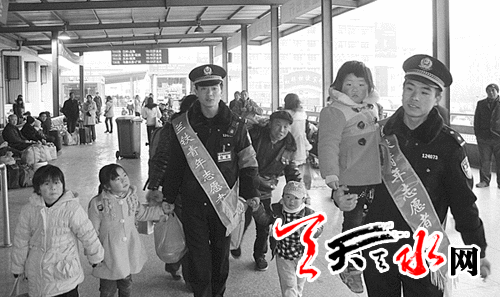 2014年春运,天水火车站广场以及候车大厅里,那些身披“春运青年志愿者”绶带的铁路民警给旅客们留下了深刻印象。他们在进站口、在候车室、在人员密集场所,用“一个微笑、一声问候、一把搀扶、一杯热水”,让寒冬出行的乘客感到丝丝温暖,安心踏上旅程。
