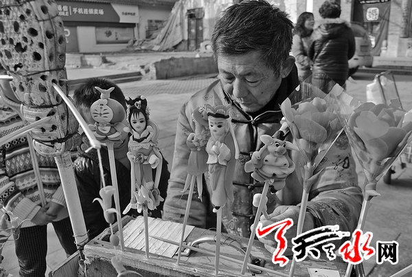 2月19日下午,冬日的暖阳照耀着秦州大地,大街上人来人往,在陕省会馆门前围了好多人,原来大家是在看捏面人的。