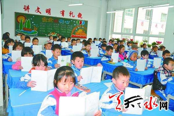 2月27日,天水市公园小学一年级的学生手捧包了书皮的国家免费教科书上课。