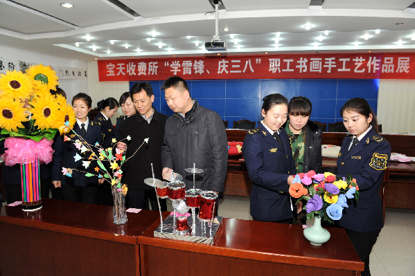 同时,宝天高速收费所举办了庆“三·八”女职工书画、摄影及手工艺作品展,极大的丰富了宝天高速广大女职工的精神文化生活,此次展出的作品是该收费所女职工在闲暇之余精心制作的,作品内容丰富、取材广泛,涉及书法、美术、摄影、十字绣、手工编织、剪纸等作品70余件,从不同侧面展示了宝天高速广大女职工的精湛手艺和精神风貌。