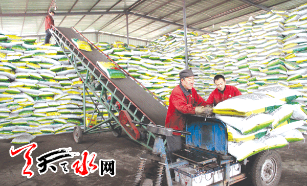 (3月6日,几名工人正在天水润德沼气开发公司车间内搬运有机肥料。春耕在即,麦积区狠抓全力做好种子、化肥、农药等农资的调运和销售工作,确保了农资供应充足,农民购买放心。 本报记者 董斌博 摄)