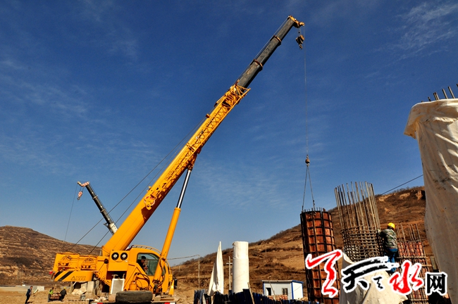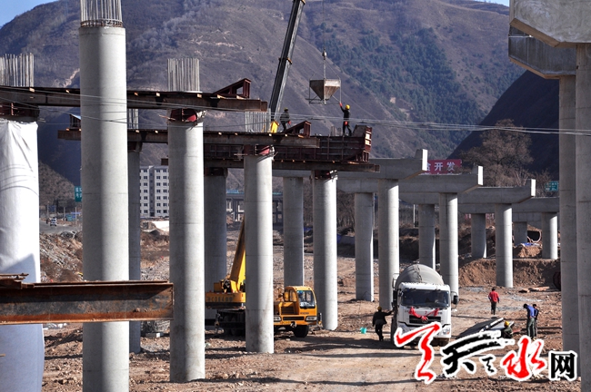 3月14日,由青岛公路建设集团承建的十天高速公路甘肃段土建工程第二十四(ST24)合同段位于天水皂郊段的工人正在利用机械浇筑水泥桥墩。