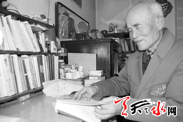 井俊龙老人平时关心政治、喜欢看书看报,在他工作期间直到退休,他一直坚持着写作这一爱好,他写的消息、散文等130多篇作品曾在《天水日报》、《天水晚报》、《火红年华》以及《老年体育报》等刊物上刊发。记者在他家中看到,老人不大的房子里,就有三个书架,上面均整整齐齐地摞满了各种书籍。闲暇之余,老人便在家里听新闻、看书、写作。