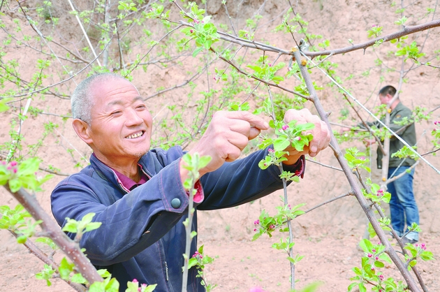 两个多小时的闲谈中,花甲之龄的焦岁喜始终没停下手中的活。树上树下,疏花眼疾手快,并用随身携带的大剪刀,间或再修正一下岔出的果树枝条,脸上挂满汗水,却不言辛劳。“现在就是年轻人不愿意干,都跑城里打工去了。”说到这里,他的神情有点落寞。