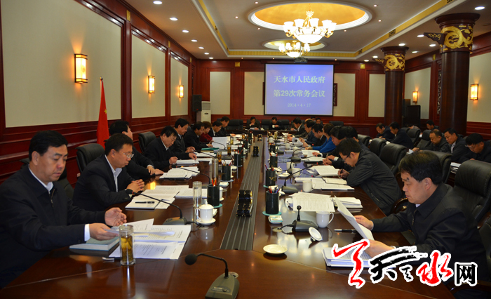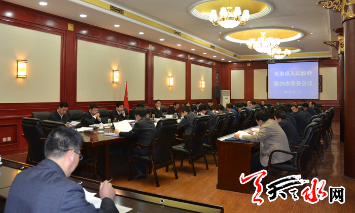 天天天水网讯【记者 郝勤学 实习生 张丹峰】4月17日上午,中共天水市委副书记、市长杨维俊主持召开市政府第二十九次常务会议,审议《天水市食品安全事故应急预案》、《关于银行业金融机构进一步支持加快脱贫致富步伐推进农业现代化的意见》等事项,听取全市大气污染防治等有关工作情况的汇报。