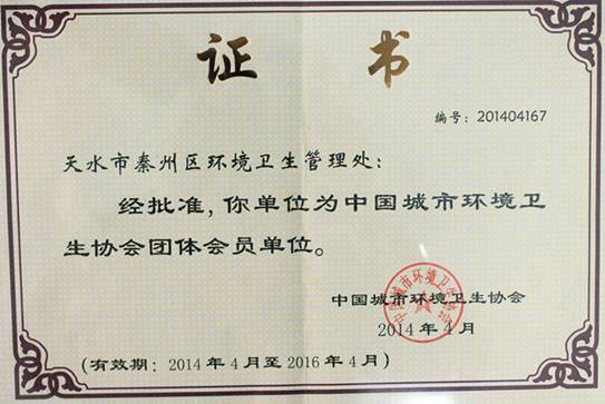 天天天水网讯(通讯员 董文明)近日,经中国城市环境卫生协会研究,同意接纳秦州区环境卫生管理处为中国城市环境卫生协会注册团体会员。