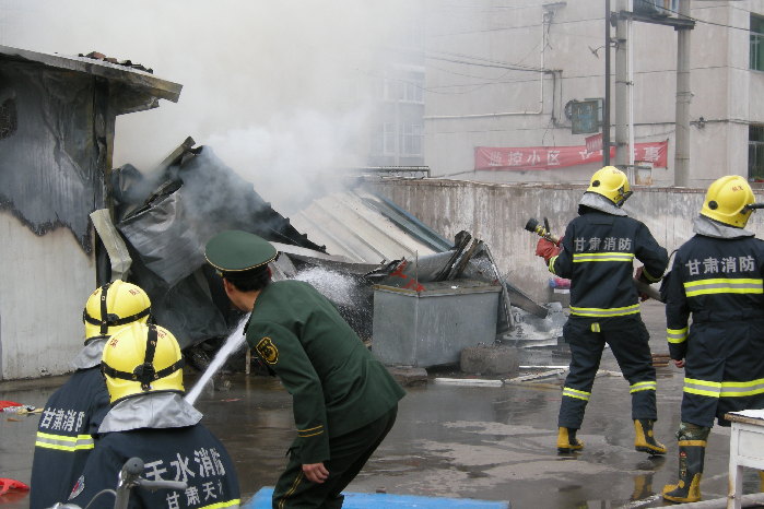 天天天水网讯(通讯员 窦耀辉)4月22日下午17时许,麦积区桥南林水东路十字路口早点市场一售早点销售摊点的活动板房发生火灾,火光冲天,烟雾迷漫,麦积消防官兵出动4辆消防水罐车迅速赶到和麦积区综合执法人员接到火警第一时间赶到现场,合力进行扑救。
