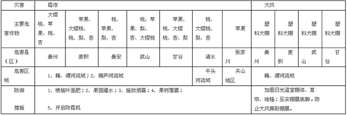 霜冻主要影响作物为正处于盛花期—坐果期的大樱桃、桃、苹果、梨、杏等果树,危害遍及我市各县(区)。重点影响县(区)为秦州、麦积及秦安;重点影响流域为藉渭河流域及葫芦河流域。
