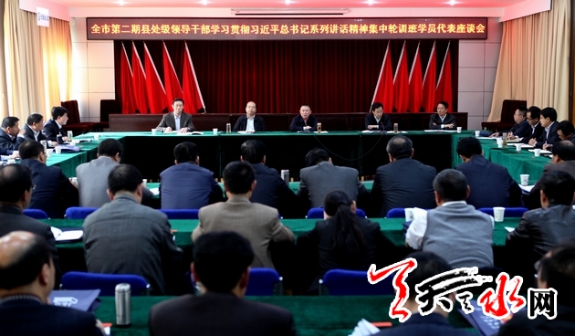 天天天水网讯【记者 王晓馨】 4月24日,全市县处级领导干部学习习近平总书记系列重要讲话精神第二期集中轮训班召开学员代表座谈会。市委书记王锐出席座谈会并讲话强调,全市各级党组织及广大党员干部要将学习贯彻习近平总书记系列讲话精神作为政治理论学习的重要内容,坚持不懈地抓紧抓好,促进思想认识、理论水平和工作能力提升,努力以讲话精神指导工作实践,及时把学习成果转化为实际行动,为全市经济社会转型跨越发展作出应有成绩。