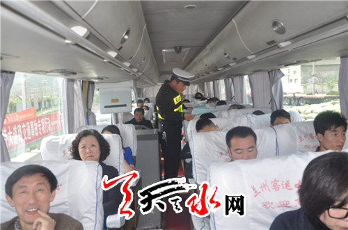 (民警向乘客发放高速公路行车注意事项)