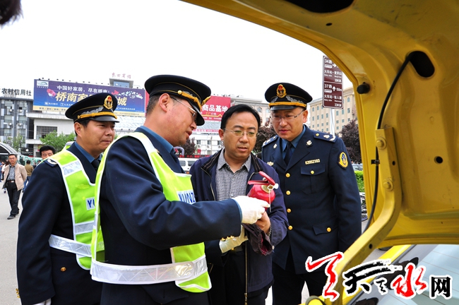 天天天水网讯;(记者何永德)为给“五一”期间天水旅游市场创造一个祥和安全规范的营运环境,天水市运管局稽查大队会同秦州、麦积分局组成的稽查组三天来,全力以赴奋战在道路营运一线,5月3日上午,以该局局长张宪泉带队的稽查组又一次对麦积区火车站及景区营运市场进行突击检查。