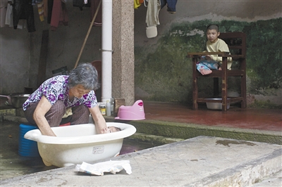 5月22日,18岁的林勇彬行动缓慢地帮忙干家务活。因患痴呆,他曾被父亲两三次丢弃至寺庙。