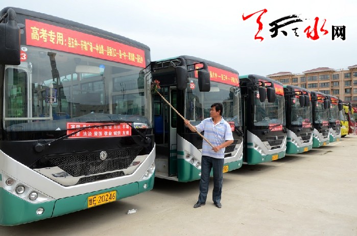 天天天水网讯(通讯员杨兆康) 高考在即,清水县各级各部门积极筹备高考,我们的司机朋友也不列外。6月6号,在清水县顺达公司院内,上面贴有“免费接送考生”字样的出租车,标有醒目路线标志的公交车整齐排放着,这标志着 “高考爱心车”为高考学生服务活动正式启动。