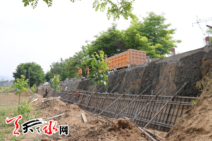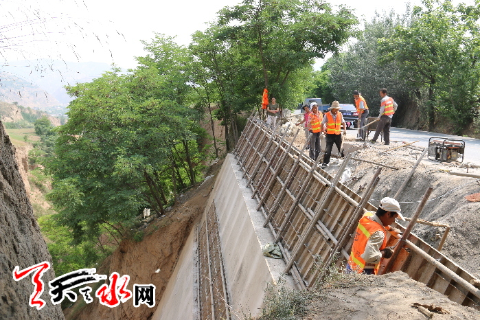 天天天水网讯 (通讯员令平虎)为改善省道207线靖天路的通行条件, 今年4月底以来,由秦州公路段负责施工的K324-K342段安保工程,截止6月12日,已完成砼挡土墙7处1380立方,1道涵洞完成半副4.25米,预计总量为10处1961.5立方的安保工程6月底全部完工。图为该段施工人员在修筑砼挡土墙。