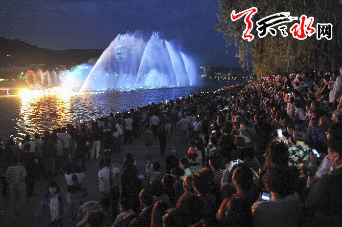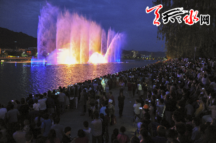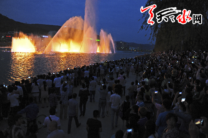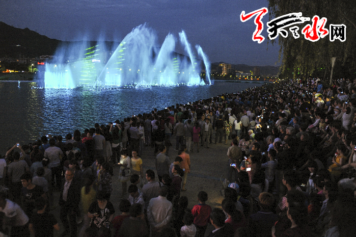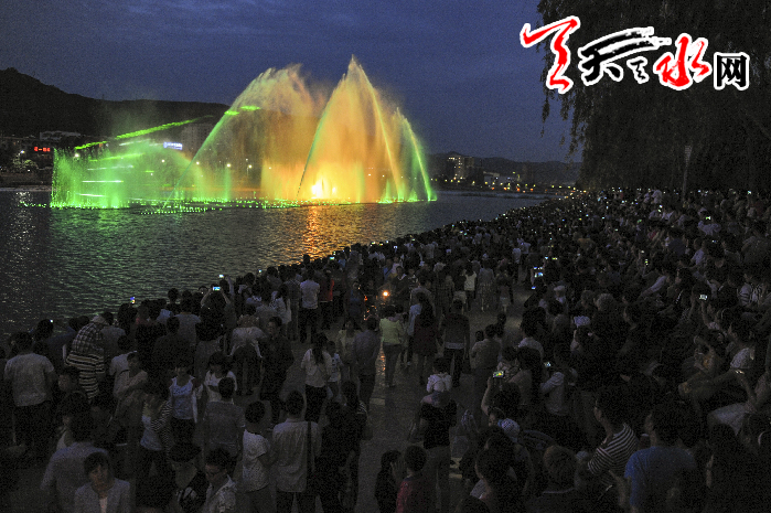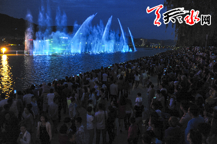 6月14日晚,市民在秦州区藉河风情线观看音乐喷泉。该喷泉位于藉河风情线3号橡胶坝至4号橡胶坝段水体内,喷泉用一流的专业音响配合流线型的水型、激光、水幕投影等将通过声、光、电、水融为一体,将多种自然景观和天水的历史文化通过水幕展现在人们眼前。