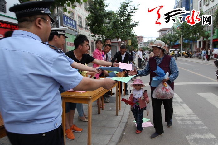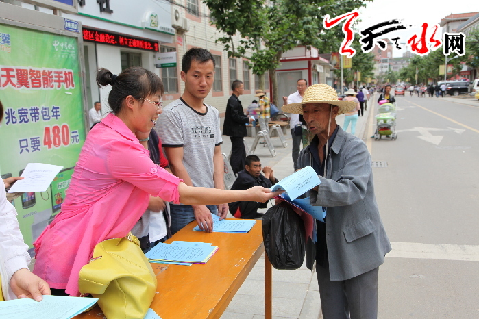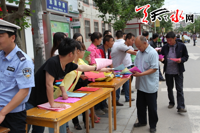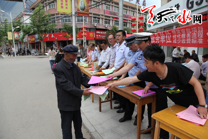 天天天水网讯(通讯员 樊馗)6月19日,清水县委宣传部组织发动县属32家执法部门和窗口服务单位在城区主街道集中向广大群众发放党的群众路线教育实践活动“精简审批事项、优化服务流程、减少收费标准”公开承诺书宣传单。