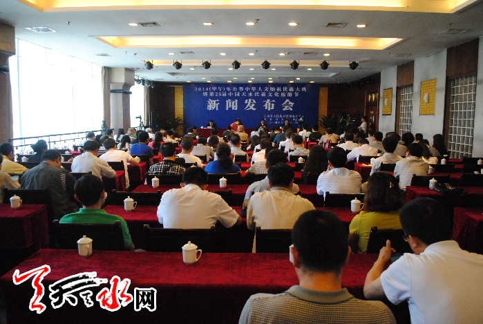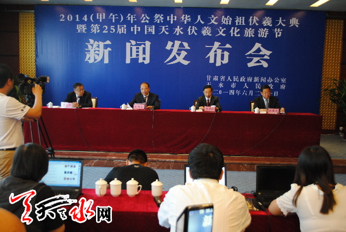 天天天水网讯(记者王晓馨 见习记者黄虹)6月21日下午,省政府新闻办公室和市政府在天辰大酒店举行了2014(甲午)年公祭中华人文始祖伏羲大典暨第25届中国•天水伏羲文化旅游节新闻发布会。市委常委、宣传部长彭鸿嘉出席发布会并介绍了公祭伏羲大典及节会有关情况。