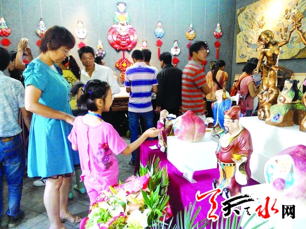 记者了解到,此次展出的泥塑作品有60多件,主要以天水伏羲文化、图腾文化、十二生肖文化为主旨,以深层次的形式表现出天水民间传说和其文化内涵。值得一提的是,我市省级泥塑传承人何彦云在传统泥塑创作中,以壁画的形式,融入图腾文化元素,结合民间传说,创作出泥塑壁挂新品。在他的众多作品中,尤以仿麦积山石窟肉塑作品吸引了众多参观者的眼球。以天水当地木材犁木、核桃木为主的仿明清家具系列,其厚重的色彩,大气典雅的线条,精美的雕刻花纹,引得众多观者感叹制作者精湛的技艺。壁画展区40多幅以麦积山石窟佛像和壁画的临摹画、庙宇道场水陆画为主。尤其是董瑞军临摹的麦积山石窟佛像临摹画,让众多观者发出啧啧的赞叹声:就像是看到真正的雕塑一般,立体感特别强。不少观者现场请教其画法技艺。