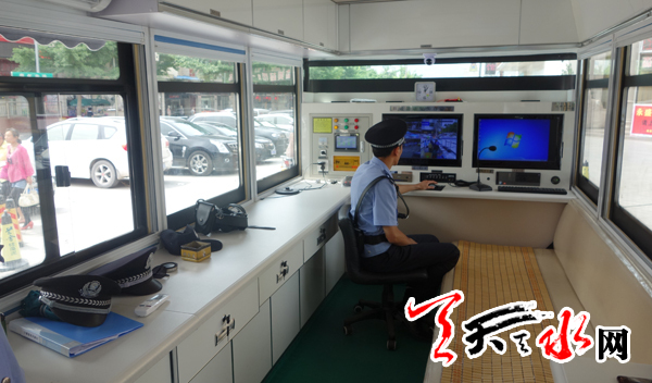 在车辆的后边,有两个电脑屏幕,一个屏幕是监控信息,另一个是电脑,可以实现移动办公。民警董钰涵告诉记者:“此类车是经过精心设计的专用警务车辆,车内除了配备各种办公设备和警用设施外,还配备了车载3G无线网络实时传输系统等高科技硬件设施,便于在治安复杂区域开展警务活动。同时,该车安装了防水功能的高清监控摄像机,车顶前后左右各一个,有效拍摄距离为150米,可360度旋转,通过车载3G无线网络,可将现场监控画面实时传输至指挥中心,还可以对过往的可疑车辆、可疑人物等进行查控追踪。”