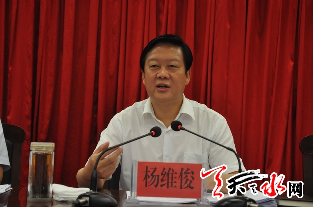 杨维俊要求,做好下半年各项工作,完成全年目标任务,困难很多、压力很大,但困难再多、压力再大,实现预期目标的决心不能有丝毫动摇。各级各部门要紧紧围绕赶超进位,全面完成各项目标任务,确保增长性指标全面完成,控制性指标不超上限。要充分利用战略平台,抓好丝绸之路经济带天水段建设的谋划,抓好华夏文明传承创新区建设,进一步加快关中—天水经济区规划的实施,抓好中央和省上政策措施的对接落实。要始终把项目工作牢牢抓在手上,深入推进“3341”项目工程,重点抓好100个市列重大项目的实施,在建项目加快进度,前期项目盯紧抓牢,招商项目跟踪落实,保持固定资产投资强度。要推动产业提质增效,确保经济指标超额完成。农业上,要坚持不懈抓好“48113”现代农业推进计划的实施,全力打造果品、蔬菜、畜牧、劳务“四大百亿元”主导产业。要积极推进土地流转和农村经营体制创新,扶持发展农民专业合作经济组织,依托农产品资源优势,积极培育“百强龙头企业”,进一步延伸产业链条,不断提升农业产业化水平。工业上,要围绕打造机械制造、电工电器、电子信息、医药食品、建筑建材、能源化工等“六个百亿元工业集群”,深入实施“12341”行动计划和“10强50户”工程,促进工业经济提质扩量增效。要抓好重点企业的生产经营,抓好重点工业项目的实施,努力提高建筑业增加值。第三产业上,要加快重点商贸项目建设,改造提升传统服务业,积极发展健康服务业、养老服务业等生活性服务业,大力发展生产性服务业。要把发展电子商务作为加快新型服务业发展的重点,鼓励有一定实力的企业开展网络销售业务,积极推进“特色中国—天水馆”建设,实现我市特色优势产业提升发展。要高度重视城市建设,坚持中心城区建设和推进城镇化并重、城市建设和城市管理齐抓,切实加快城市基础设施建设,全面完成保障房建设任务,不断提升城市管理水平,合力推进新型城镇化。要深化重点领域改革,继续加大简政放权力度,努力促进小微企业和非公经济发展,切实增强经济社会发展活力。