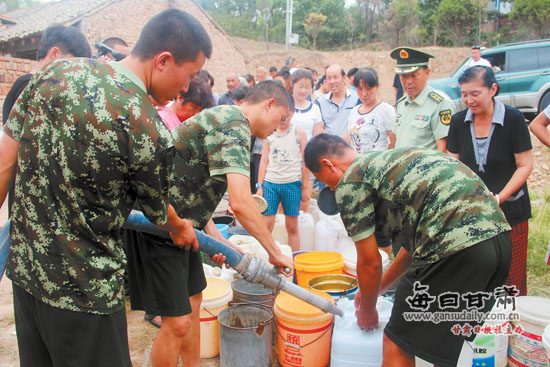 为缓解旱情,解决居民吃水难问题,天水市启动应急预案,采取限制或暂停大户用水、分时分区供水、组织水车送水等方式,确保居民生活用水不出问题。8月4日,天水市消防官兵兵分四路,给秦州区王家半坡、左家场、罗峪沟、皇城路四个区域送去饮用水。当消防官兵将自来水接入当地居民的桶中时,他们纷纷竖起大拇指,对消防官兵不顾炎热送清凉的善举表示感谢。