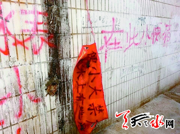 记者接到反映,来到罗玉小区该通道查看,还未走近就闻到了一股臊臭味。只见该通道南侧的两面墙及地上布满尿渍、污垢,很多小区居民路过这里都是快步掩鼻通过,可见这里被人当做“方便”之地已久。在墙面上,记者还看到几处用红漆书写的大字,除了“在此小便是猪”等稍显极端的警告方式,还有一处则写着“下有水表禁止小便”,墙上则悬挂着一块写有“禁止大小便,此处有上水井”字样的红布。