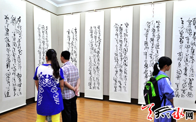 由天水市文联、市文化馆、市书协等单位主办的此次白狼书法艺术展,共展出了白狼先生近日创作的百余幅狂草书法精品力作。其作品中表现出的苍茫高古、大气淋漓、纵横飘逸的诗性线条之美,让观者赞不绝口的同时,也为天水书法爱好者提供了一次鉴赏学习的好机会。