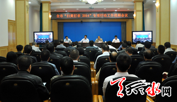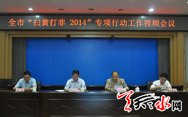 天天天水网讯【记者 童强】 9月11日,天水市召开“扫黄打非·2014”专项行动工作视频会议,通报上半年全市“扫黄打非”工作情况,安排部署“扫黄打非·2014”专项行动重点工作。