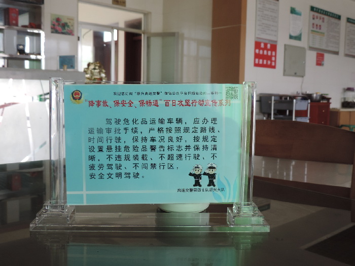 除此之外,大队在辖区隔音墙上刷写大型宣传标语10余条,粘贴大型喷绘宣传横幅12条,更换服务区宣传栏24版,在大队驻地、服务区执勤点及各收费站悬挂横幅16条,并广泛发放和张贴《致客运车辆驾驶人的一封信》、《致危化品运输车辆驾驶人的一封信》和两个《通告》等宣传品。