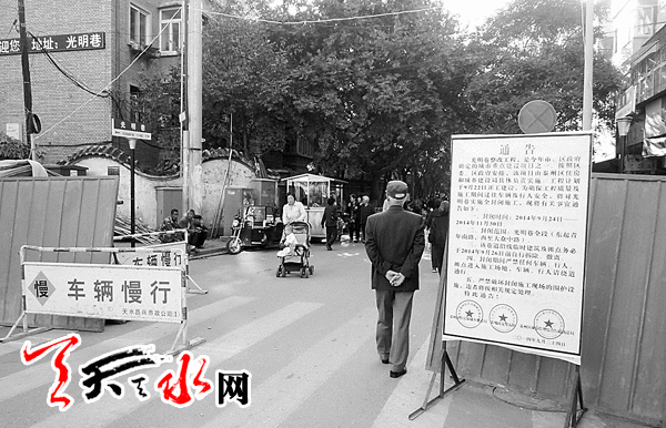 为确保工程质量及施工期间过往车辆及行人安全,秦州区住房和城乡建设局、秦州城区交警大队、秦州区综合执法局于9月24日联合发出通告,对光明巷实施封闭施工,封闭范围东起青年南路、西至大众中路。封闭期间,严禁车辆、行人、摊点进入施工现场,车辆、行人请绕道通行。