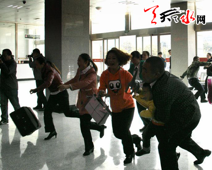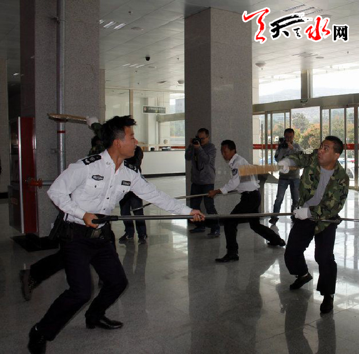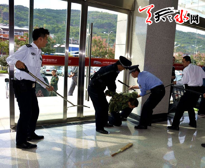 汽车客运站暴恐事件应急处置演练在中心客运站售票大厅进行,本环节演练的是车站工作人员对突发暴力恐怖事件的应对和处置能力。演练中,两名手持砍刀的犯罪分子向无辜乘客群众挥刀乱砍,造成现场秩序混乱,人员受伤。现场工作人员在第一时间紧急出动,启动应急预案,采取果断措施,经过生死拼搏将两名犯罪分子成功制服,并及时将伤者送医救治。